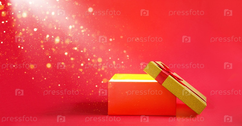 Открытая красная подарочная коробка с бантом с золотым сиянием и блеском внутри на красном фоне