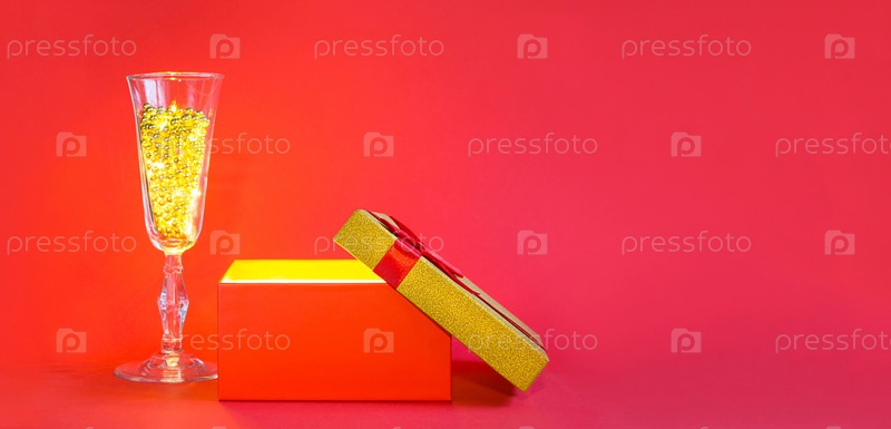 Откройте красную подарочную коробку с золотым сиянием и блеском внутри и бокалом для шампанского с пузырьковыми бусинами