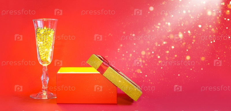 Откройте красную подарочную коробку с золотым сиянием и блеском внутри и бокалом для шампанского с пузырьковыми бусинами