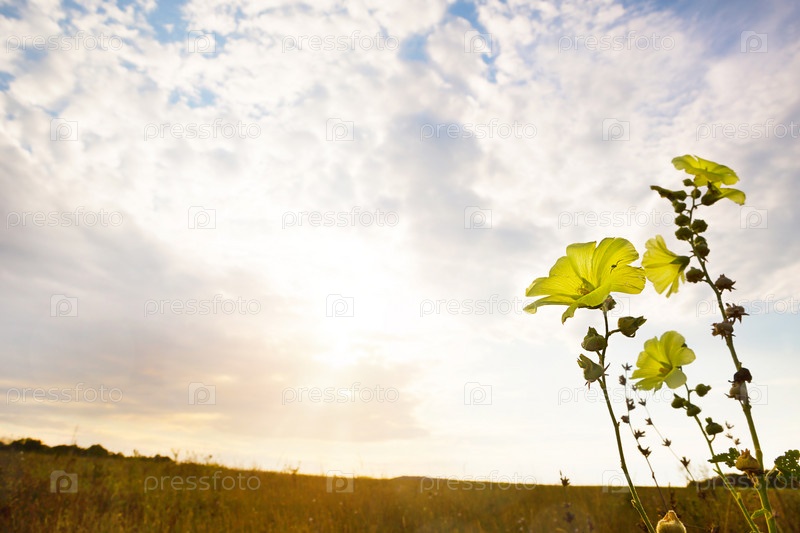 Желтый цветок на фоне красивого неба с облаками. Дикий однолетний гибискус, колокольчик, дурман, садовые растения