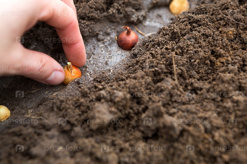 Рука сажает луковицы в землю в саду. Весна, садовые растения, работа на участке земли, озеленение, садоводство