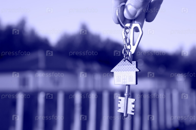 Брелок для ключей с домом для ключей в руке. Фон забора и коттеджа. Переезд в новый дом, ипотека, покупка недвижимости, аренда и бронирование жилья, мечта о жизни в деревне
