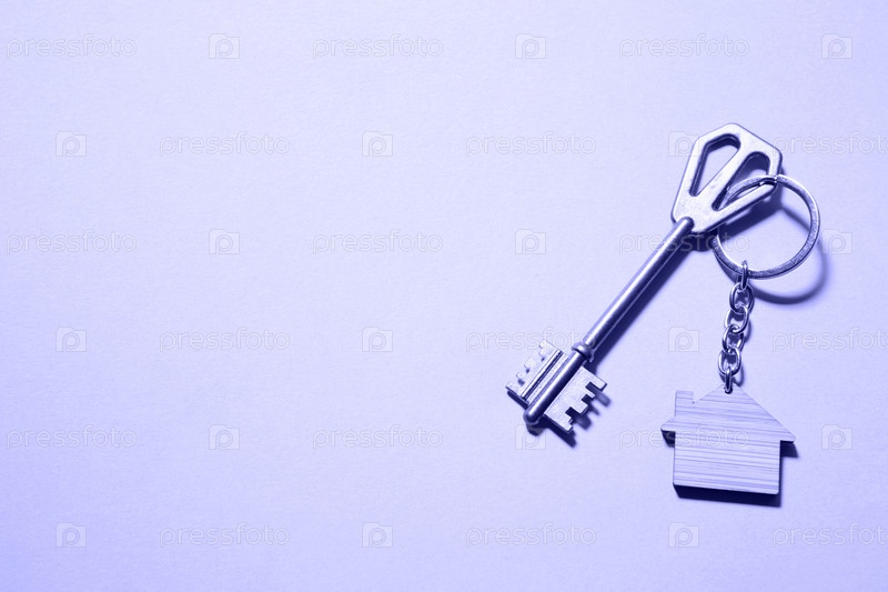 Брелок в виде деревянного дома с ключом на фиолетовом фоне. Очень пери тонировка. Строительство, дизайн, проект, переезд в новый дом, ипотека, аренда и покупка недвижимости