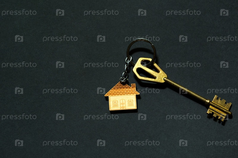 Брелок в виде деревянного дома с ключом на фиолетовом фоне. Очень пери тонировка. Строительство, дизайн, проект, переезд в новый дом, ипотека, аренда и покупка недвижимости