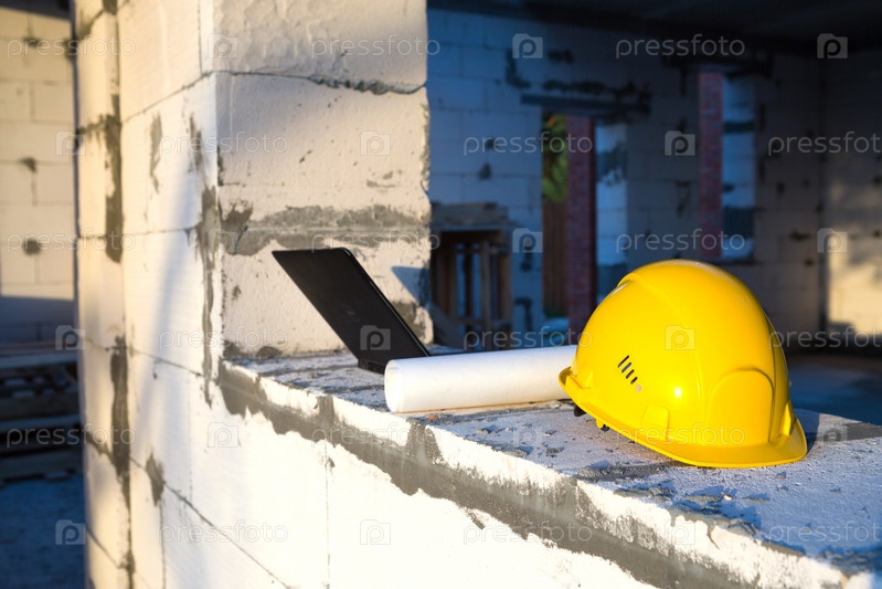 Строительная каска, рисунок и ноутбук на окне строящегося дома. Рабочий процесс, архитектура и проектирование