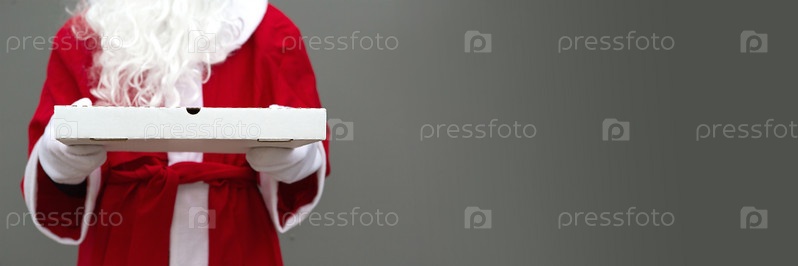 Белая коробка из-под пиццы в руках у Деда Мороза в белых варежках, с бородой, в красном пальто. Рождественская доставка фаст-фуда. Предновогодняя акция. Работа по организации питания в праздничные дни. Скопируйте пространство, макет. Баннер