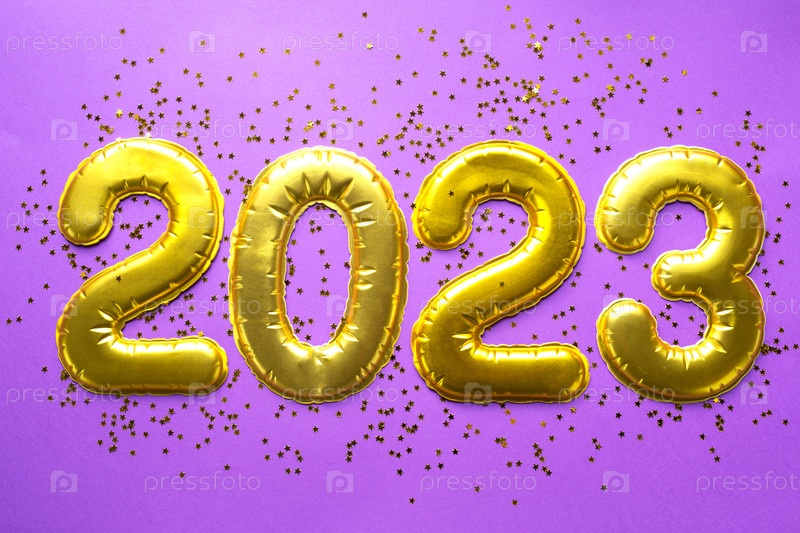 С Новым годом - золотые цифры 2023 года на фиолетовом фоне с блестками, звездами, блестками, огнями гирлянд