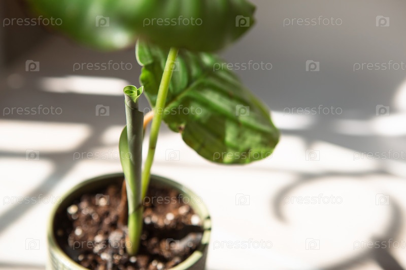 Росток Калатея Орбифолия разворачивает зеленый лист крупным планом на подоконнике при ярком солнечном свете с тенями. Комнатные растения в горшках, зеленый домашний декор, уход и выращивание, марантовые сорта