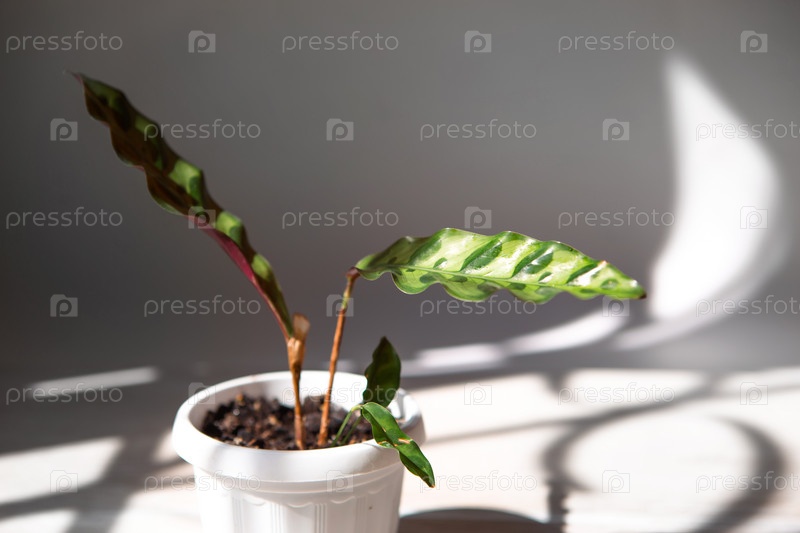 Calathea lancifolia зеленый образец листьев в крупном плане на подоконнике под ярким солнечным светом с тенями. комнатные растения в горшках, зелёный домашний декор, уход и выращивание, сорты маранто