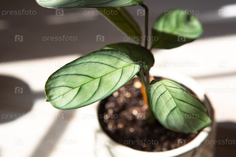 Ctenanthe burle-marxii Amagris, крупный план мяты Calathea на подоконнике при ярком солнечном свете с тенями. комнатные растения в горшках, зеленый домашний декор, уход и выращивание