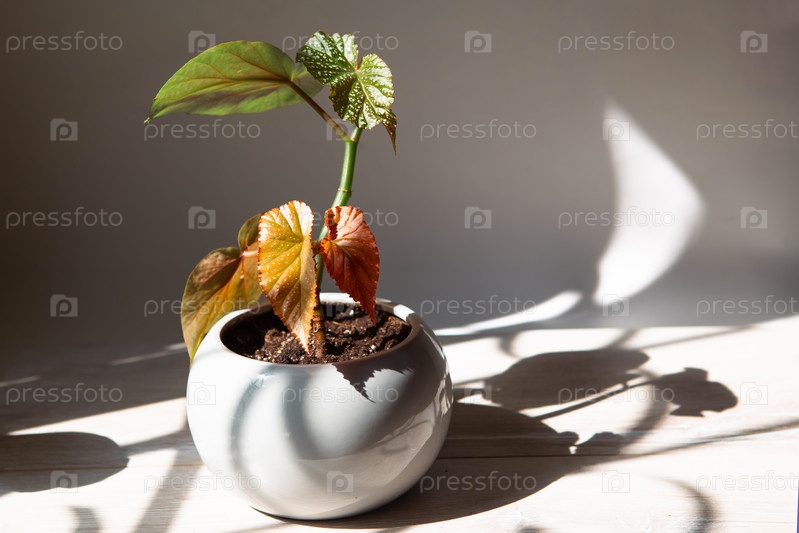 Коралловый бегония Corallina, крупный план argentea-guttata с серебристыми пятнами при ярком солнечном свете со тени. комнатные растения в горшках, домашний декор, уход и выращивание