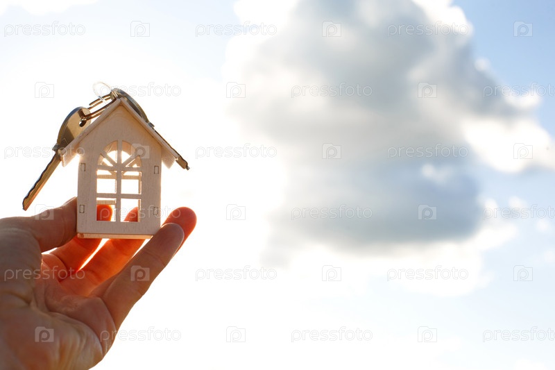 Белая деревянная фигура дома и ключи в руке на фоне неба и поля. Мечта о своем доме, строительство коттеджа в деревне, план и дизайн, сдача проекта, переезд в новый дом