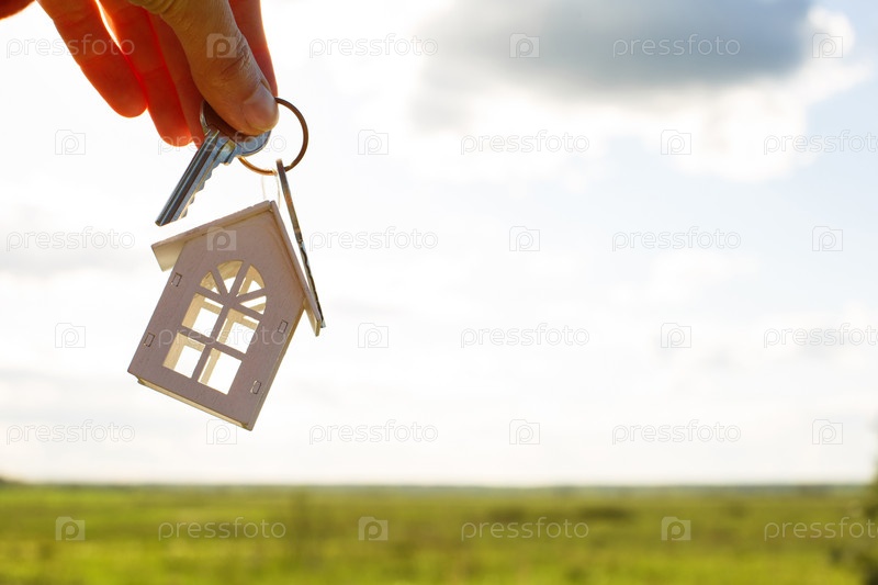Белая деревянная фигура дома и ключи в руке на фоне неба и поля. Мечта о своем доме, строительство коттеджа в деревне, план и дизайн, сдача проекта, переезд в новый дом