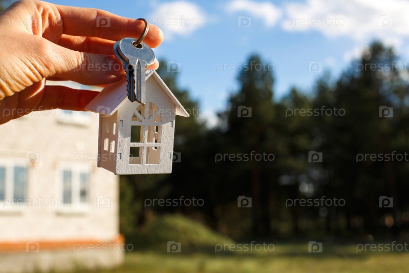 Деревянный брелок и ключи в руке на фоне недостроенного дома. Мечта о переезде, коттедж в сельской местности и завершение проекта