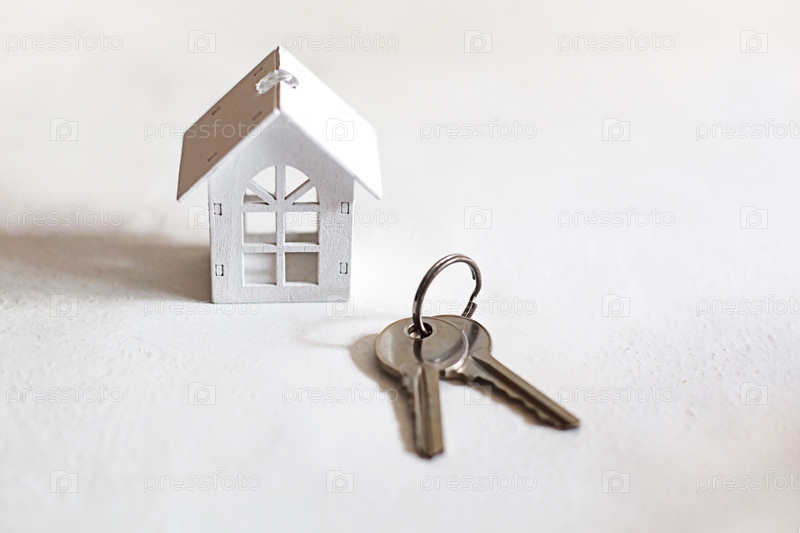 Символ белого деревянного дома и ключи на сером фоне. Концепция строительства коттеджа, планировка и дизайн, архитектурный план, переезд в новый дом, риелтор, готовый бизнес