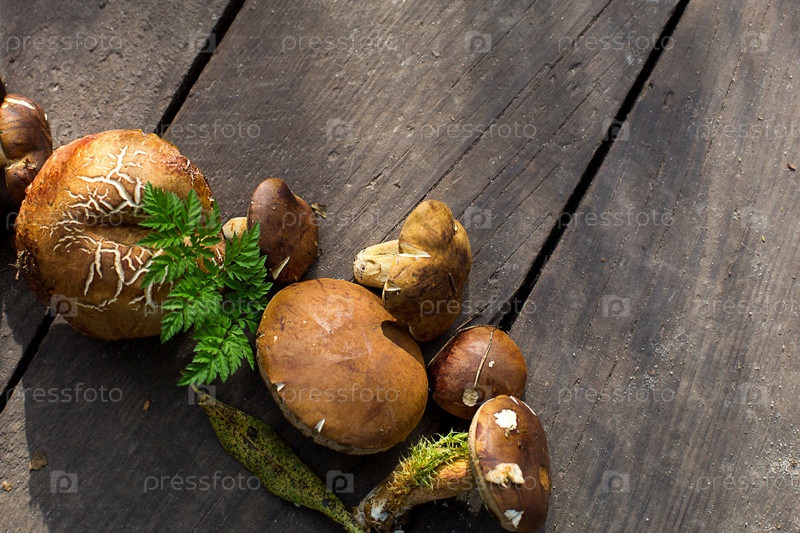 Свежие лесные грибы на деревянном фоне. Натуральная плоская кладка, дары леса, подосиновики, белые грибы