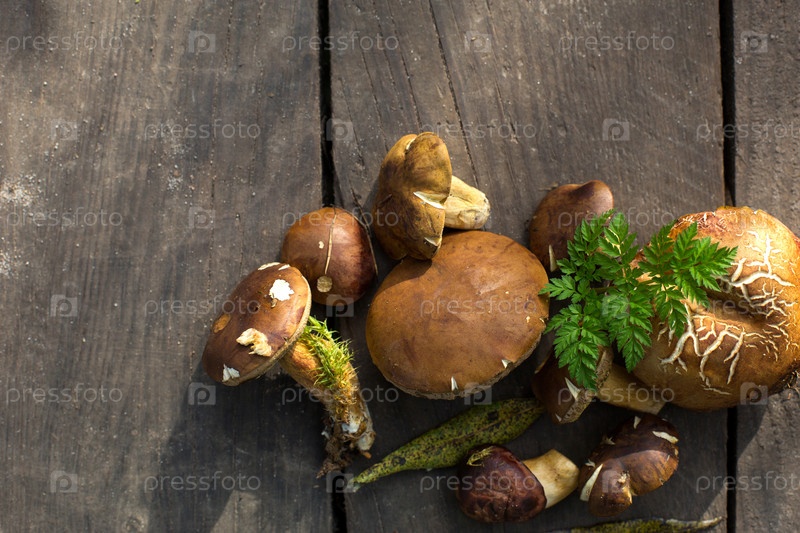 Свежие лесные грибы на деревянном фоне. Натуральная плоская кладка, дары леса, подосиновики, белые грибы