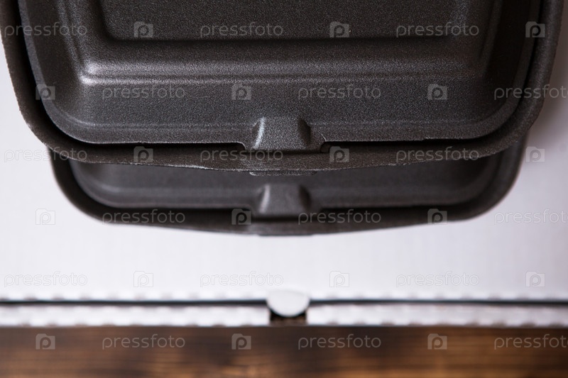 Контейнеры для доставки еды и коробка для пиццы сложены друг на друга. Служба доставки еды, готовый горячий заказ, одноразовая пластиковая и бумажная упаковка, неэкологичный мусор, забивание и переработка