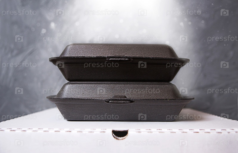 Контейнеры для доставки еды и коробка для пиццы сложены друг на друга. Служба доставки еды, готовый горячий заказ, одноразовая пластиковая и бумажная упаковка, неэкологичный мусор, забивание и переработка