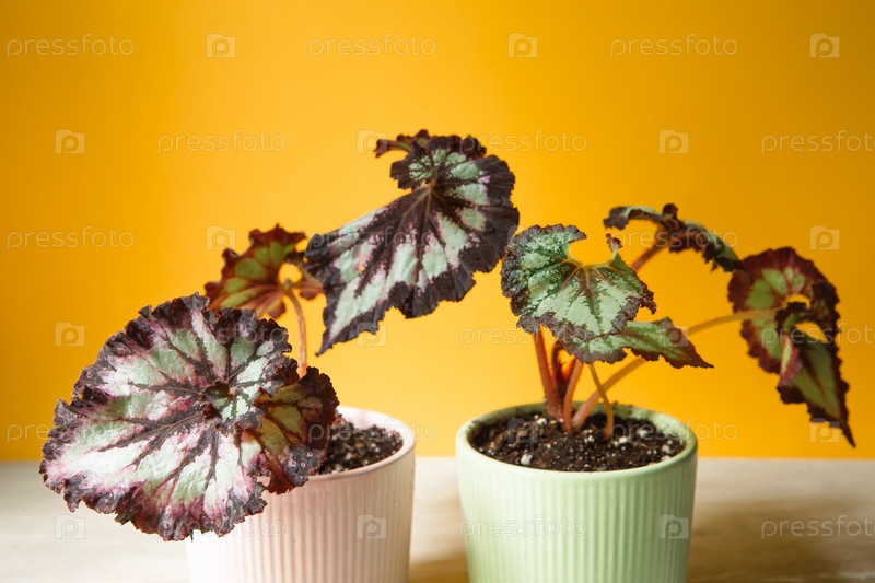 Красивые листья декоративно-лиственной бегонии с крупным орнаментом в горшке. Скопируйте пространство
