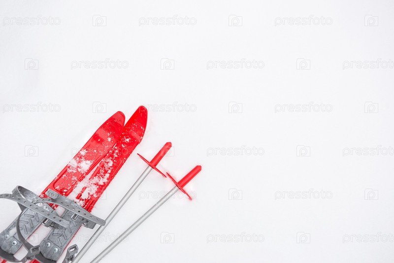 Детские красные лыжи с палками-макетом в снегу. Детский зимний спорт, активный отдых, семейный отдых