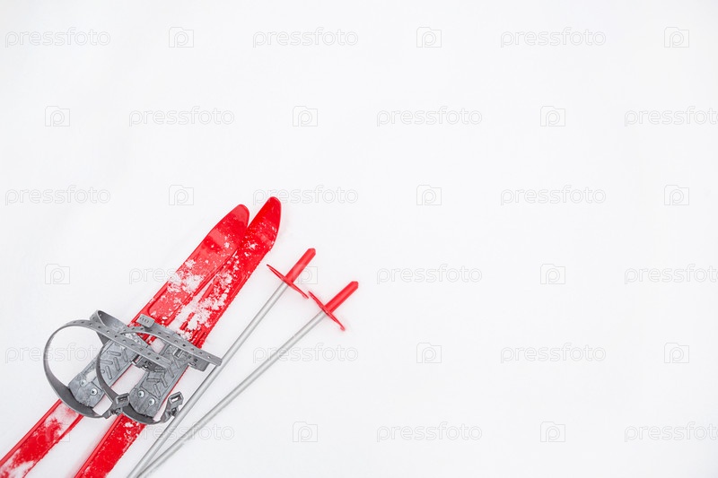 Детские красные лыжи с палками-макетом в снегу. Детский зимний спорт, активный отдых, семейный отдых