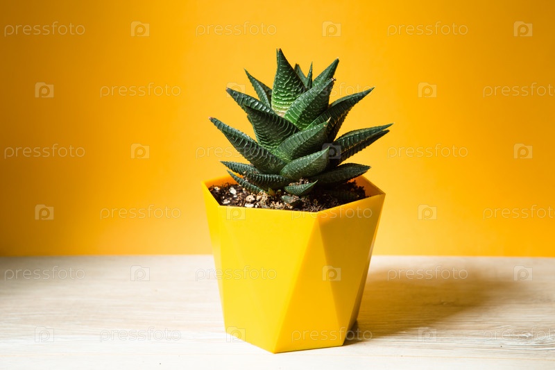 Хавортия в горшке на желтом фоне. Комнатное растение, зеленый дом, суккулент – символ гармонии