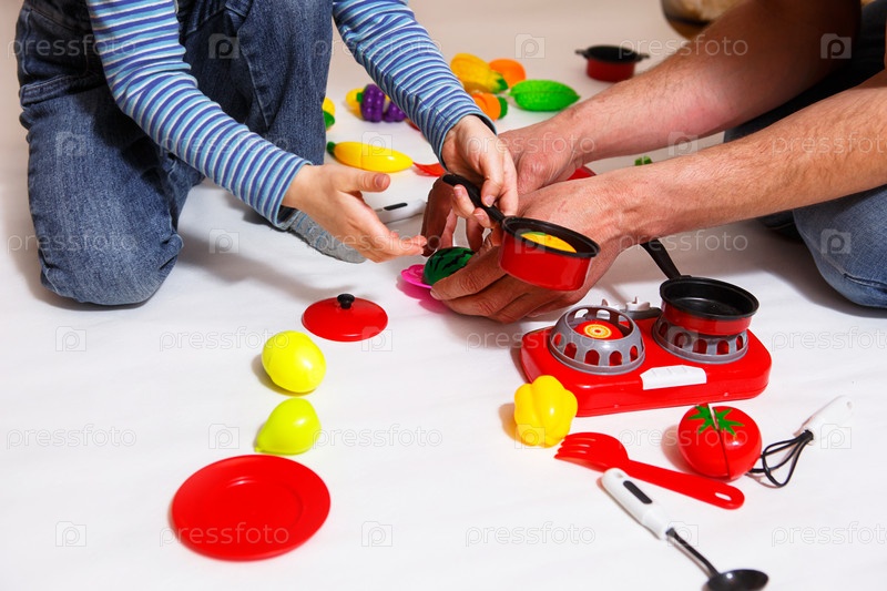 Папа и дочка играют с нарезанными пластиковыми овощами и фруктами на липучке, готовят еду на игрушечной плите в миске. Детская кулинария, девочка учится готовить