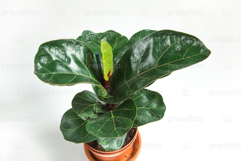 Фикус лирата бамбино в горшке на белом фоне. Выращивание комнатных растений в горшках, зеленый домашний декор, уход и выращивание
