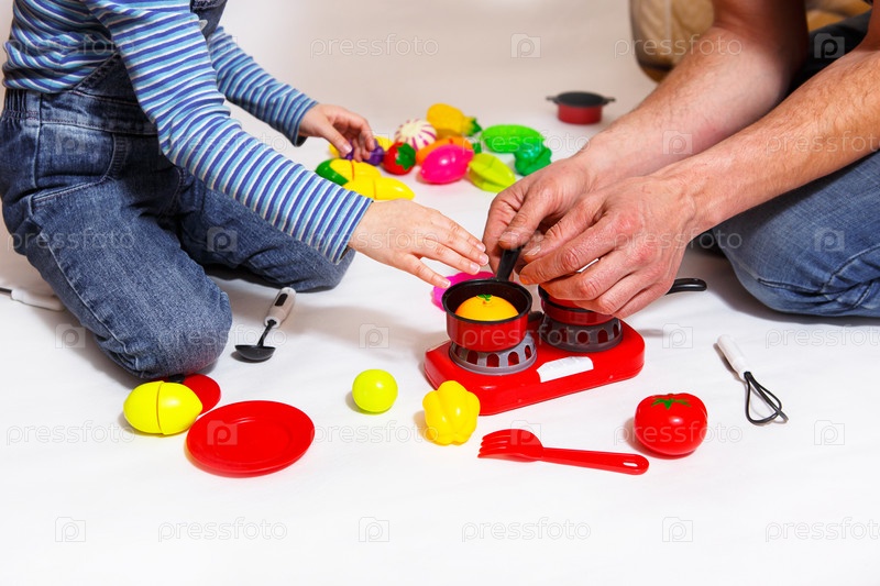 Папа и дочка играют с нарезанными пластиковыми овощами и фруктами на липучке, готовят еду на игрушечной плите в миске. Детская кулинария, девочка учится готовить. Белый фон, крупный план. День отца