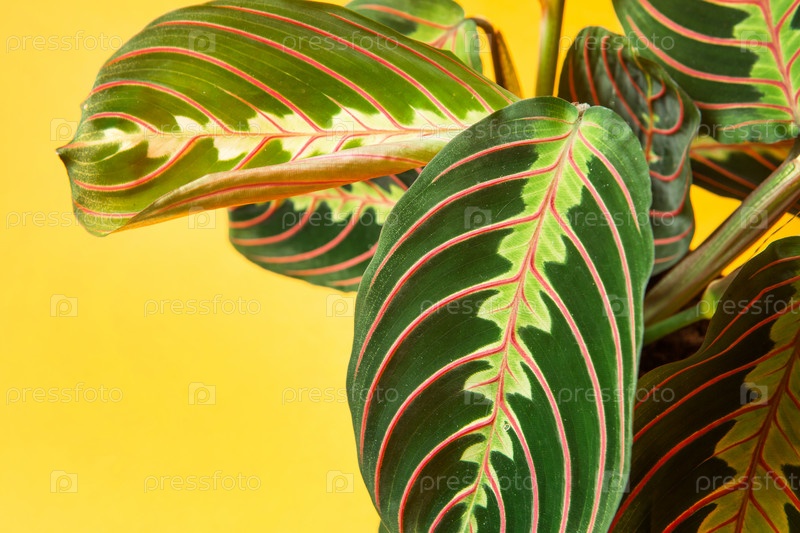 Красивые листья маранты с орнаментом на желтом фоне крупным планом. Семейство марантовых – неприхотливое растение. Скопируйте пространство. Выращивание комнатных растений в горшках, зеленый домашний декор, уход и выращивание