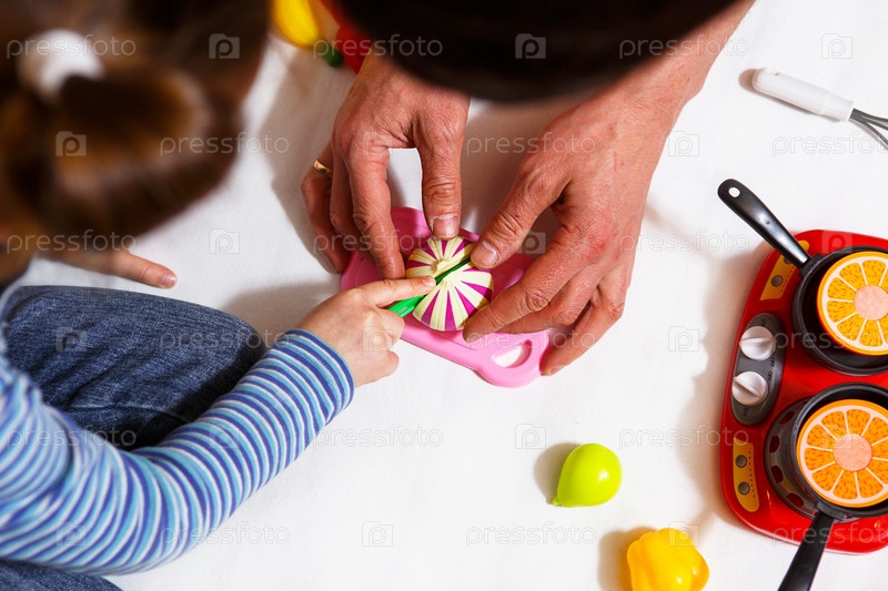 Папа и дочка играют с нарезанными пластиковыми овощами и фруктами на липучке, готовят еду на игрушечной плите в миске. Детская кулинария, девочка учится готовить. Белый фон, крупный план. День отца