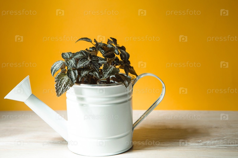 Пилея комнатного растения в белой лейке на столе на желтом фоне. Уют в доме, уход за цветами, теплица