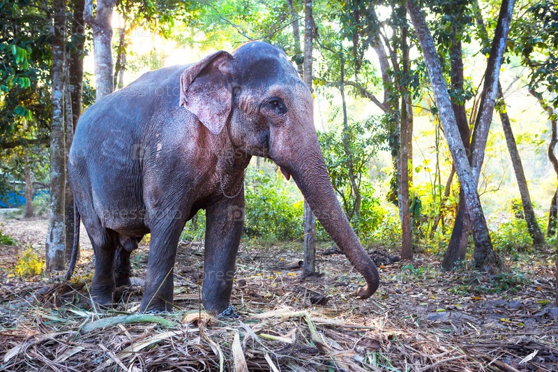 Индийский слон в джунглях на цепи – развлечение для туристов, тяжелая работа на ферме, верховая езда, экскурсии. Слон в лесу на солнце сквозь деревья