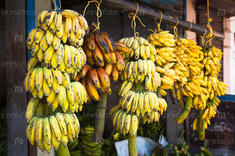 Связки бананов, свежесрезанных с дерева, продаются на рынке в Азии. Банановые сорта, уличный базар в Индии