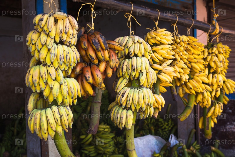Связки бананов, свежесрезанных с дерева, продаются на рынке в Азии. Банановые сорта, уличный базар в Индии