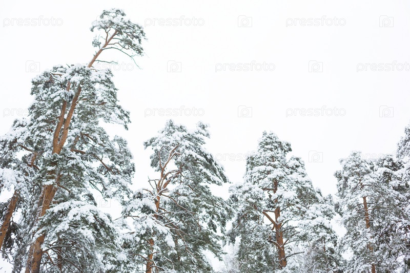 Заснеженные деревья в лесу после снегопада. Ель и сосна на белом, естественном фоне