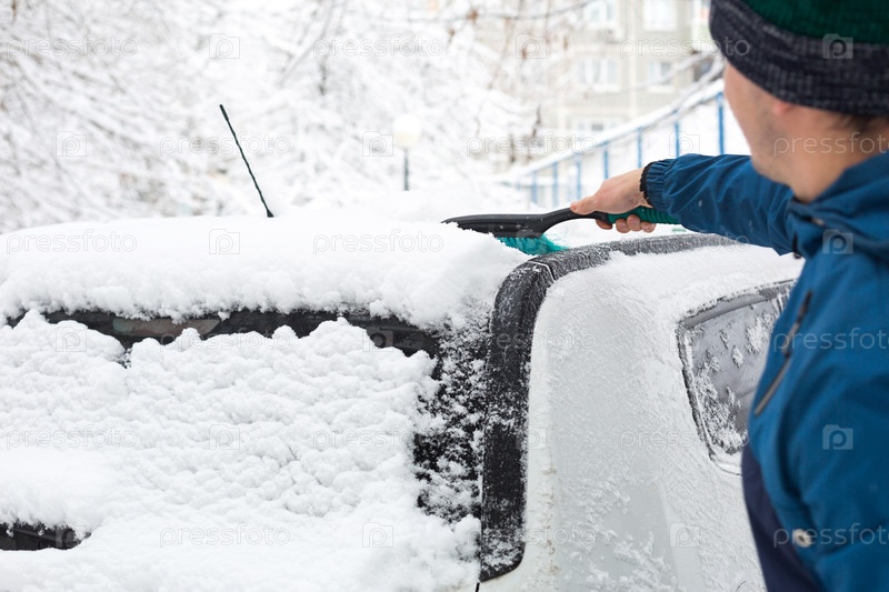 Мужчина стряхивает снег с машины после снегопада. Рука в синей куртке с автомобильной метлой на белом теле. Зимние погодные условия