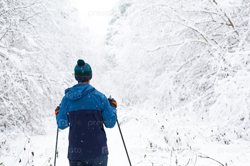 Лыжник в ветровке и шляпе с помпоном с лыжными палками в руках спиной на фоне заснеженного леса. Беговые лыжи в зимнем лесу, спорт на открытом воздухе, здоровый образ жизни