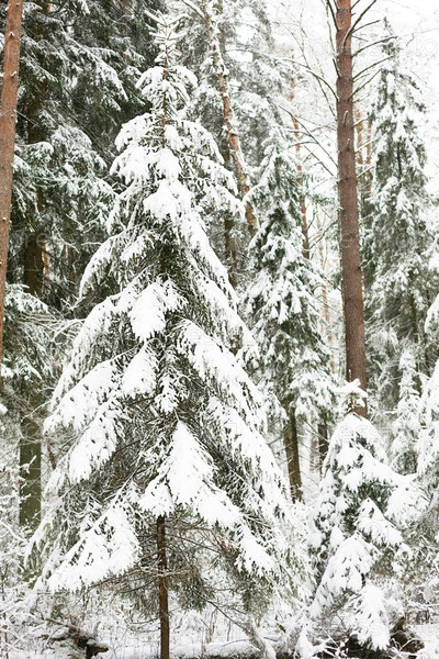 Заснеженные деревья в лесу после снегопада. Ель и сосна на белом, естественном фоне