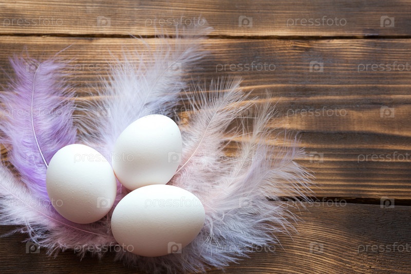 Белые куриные яйца на деревянном столе в гнезде из нежных перьев пастельных тонов. Фон пасхальной деревни, натуральные экологически чистые продукты