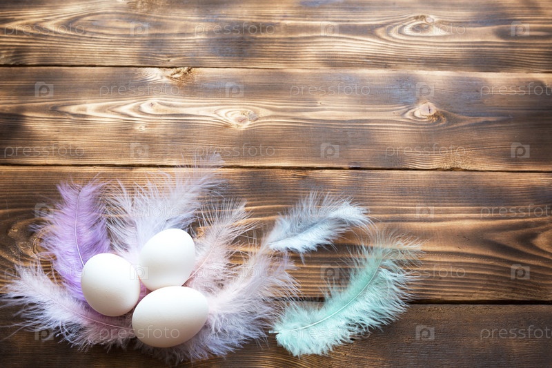 Белые куриные яйца на деревянном столе в гнезде из нежных перьев пастельных тонов. Фон пасхальной деревни, натуральные экологически чистые продукты