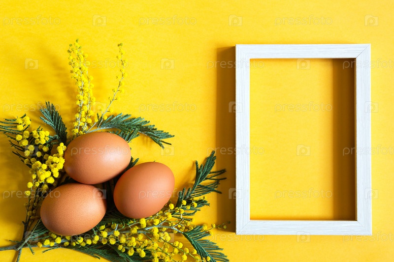 Коричневые куриные яйца на желтом фоне и ветка мимозы с тенями. Пасхальный весенний фон