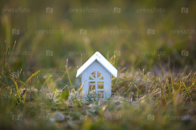 Фигурки маленьких белых деревянных домиков на траве крупным планом. Коттедж в сельской местности и поселке, строительство, проект, переезд, ипотека, аренда и покупка недвижимости