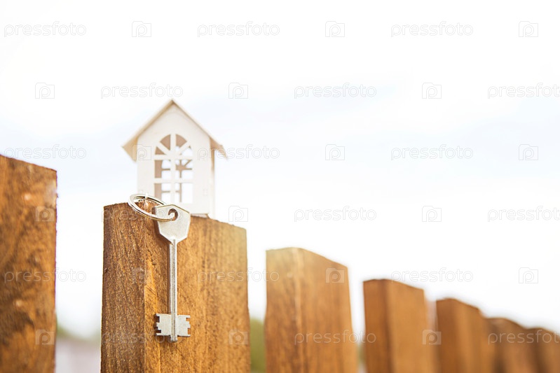 Маленькая фигурка белого деревянного дома на заборе с ключом от жилья на фоне коттеджей. Строительство, дизайн, проект, переезд в новый дом, ипотека, аренда и покупка недвижимости
