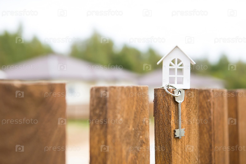 Маленькая фигурка белого деревянного дома на заборе с ключом от жилья на фоне коттеджей. Строительство, дизайн, проект, переезд в новый дом, ипотека, аренда и покупка недвижимости