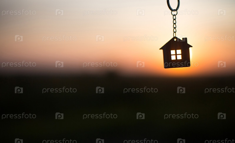 Силуэт фигуры дома с ключом, ручка с брелком на фоне заката. Мечтают о доме, строительстве, переезде в новый дом, ипотеке, аренде и покупке недвижимости