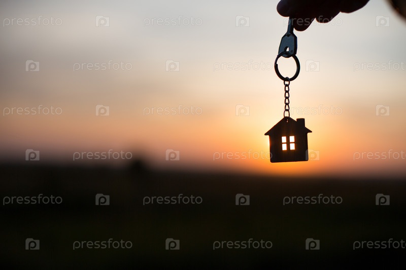Силуэт фигуры дома с ключом, ручка с брелком на фоне заката. Мечтают о доме, строительстве, переезде в новый дом, ипотеке, аренде и покупке недвижимости