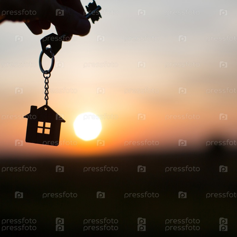 Силуэт фигуры дома с ключом, ручка с брелком на фоне заката. Мечтают о доме, строительстве, переезде в новый дом, ипотеке, аренде и покупке недвижимости