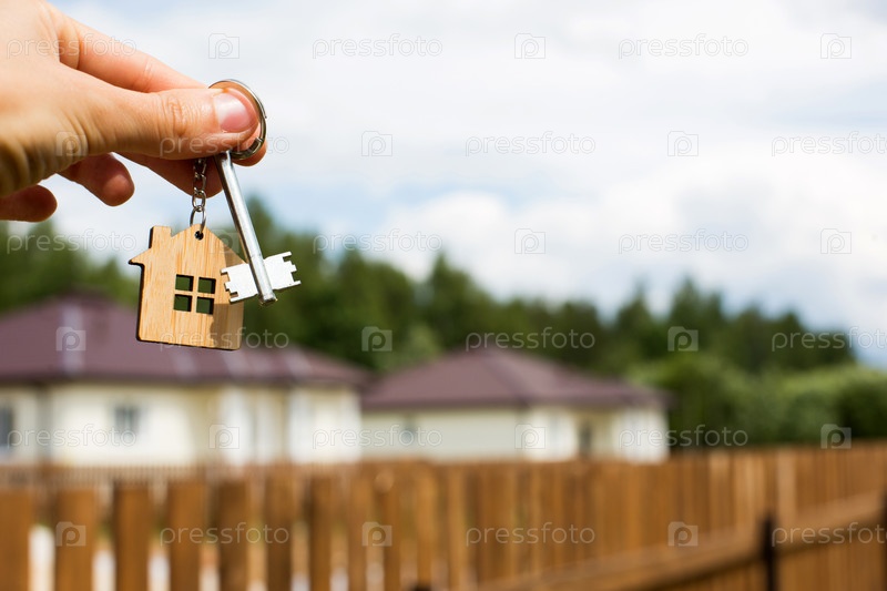 Деревянная подвеска дома и ключ. Фон забора и коттеджа. Мечта о доме, строительство, дизайн, сдача проекта, переезд в новый дом, ипотека, аренда и покупка недвижимости